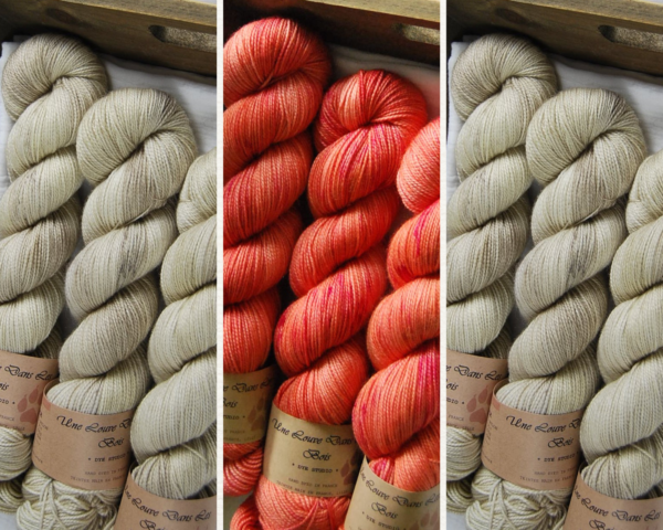 Chaque écheveau est teint à la main, en petit nombre par bain ce qui le rend unique. Il est recommandé d’alterner les écheveaux au fil du projet.