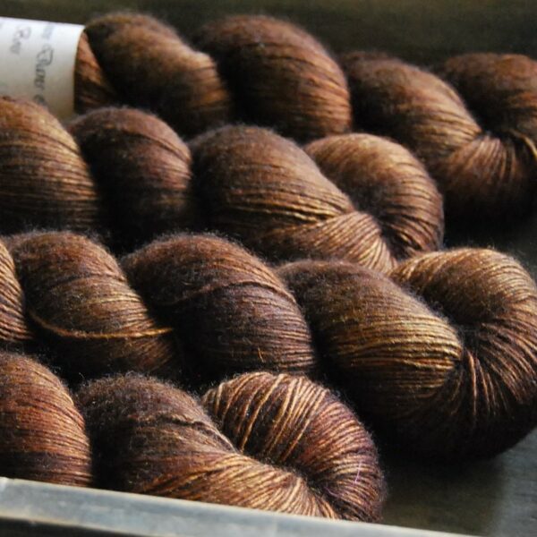 Chaque écheveau est teint à la main, en petit nombre par bain ce qui le rend unique. Il est recommandé d’alterner les écheveaux au fil du projet.