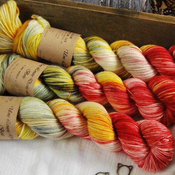 Chaque écheveau est teint à la main, en petit nombre par bain ce qui le rend unique. Il est recommandé d’alterner les écheveaux au fil du projet.